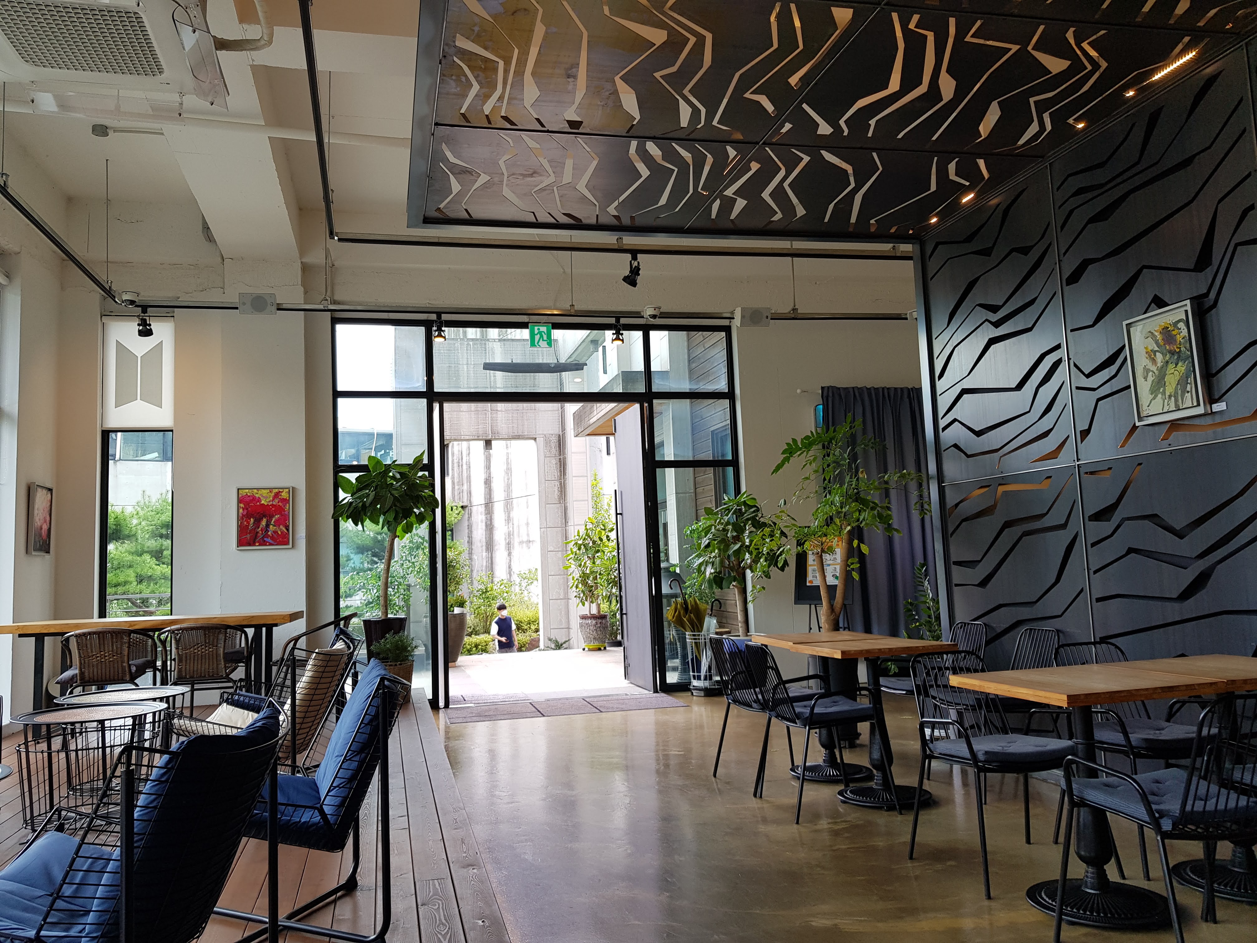 입구에서 왼쪽은 그림이 전시되어 있으며, 오른쪽은 테이블이 마련되어 있어서 서로 다른 공간에서 카페를 즐길 수 있습니다.