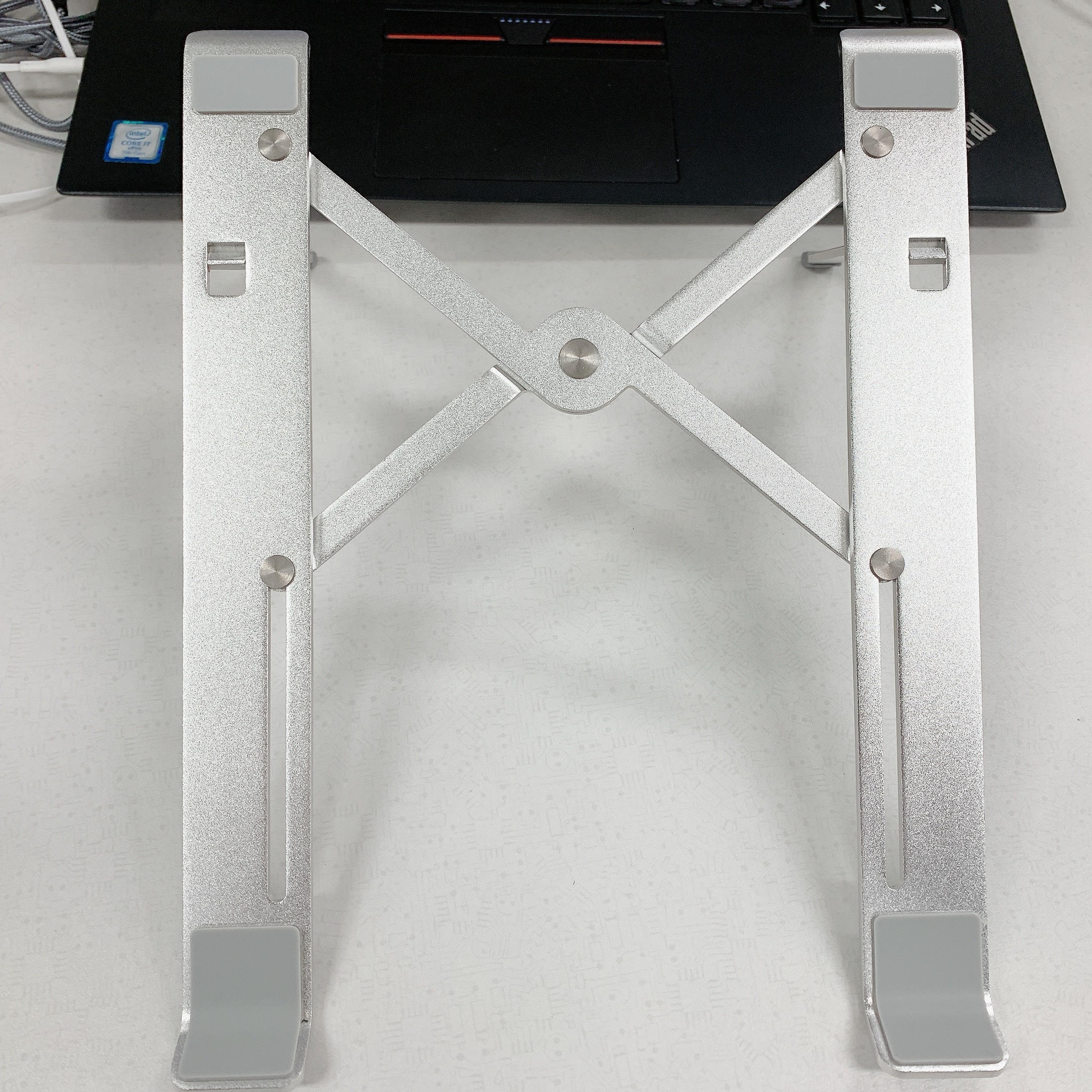 현재 노트북 거치대로는 두가지를 이용하고 있는데 개인용 노트북은 바닥에 붙여도 문제가 되지 않기에 붙여서 사용하는 <MOFT>에 나온 노트북 거치대를 이용하고 있으며, 회사에서 지급받은 노트북은 바닥에 붙이는 것은 부담이 되어서 휴대용으로 들고 다니는 제품을 구매하여 가지고 다니고 있습니다.