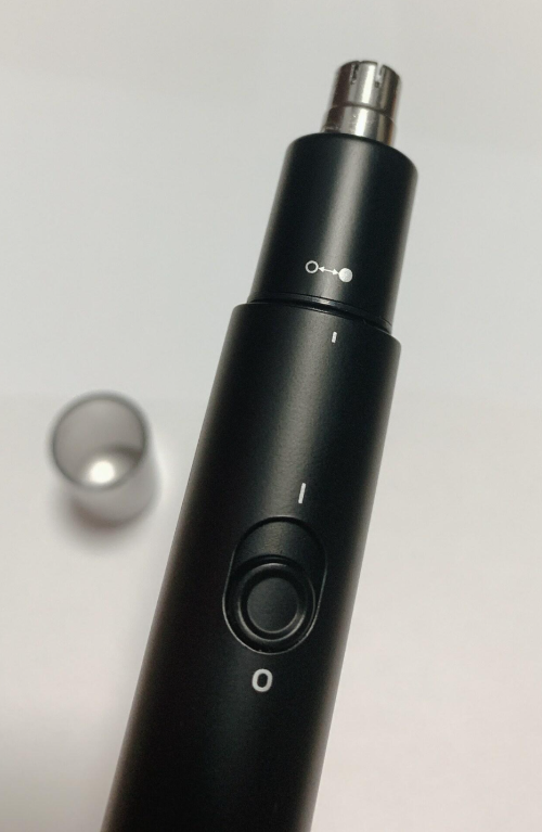 위에 캡을 벗기면 사진과 같이 홈이 있고 저기에 코털이 들어가서 전기면도기와 같이 절삭이 되는 효과가 있습니다. 스위치는 사진에 나와 있는 동그란 버튼이며, 아주 직관적으로 되어 있어서 누가 봐도 스위치인걸 알 수 있게 디자인되어 있습니다.