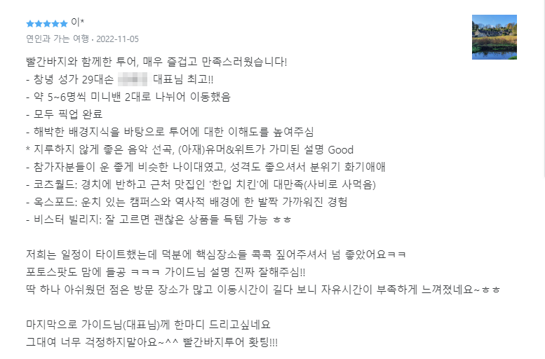 추천 사유 : 당연 후기도 좋았지만 가이드님이 진심을 다해서 여행자들이 편하게 즐길 수 있도록 해주시고 상세한 설명, 그리고 맛있는 김밥 제공까지.... 선택에 후회하지 않으실 거 같아 추천합니다.